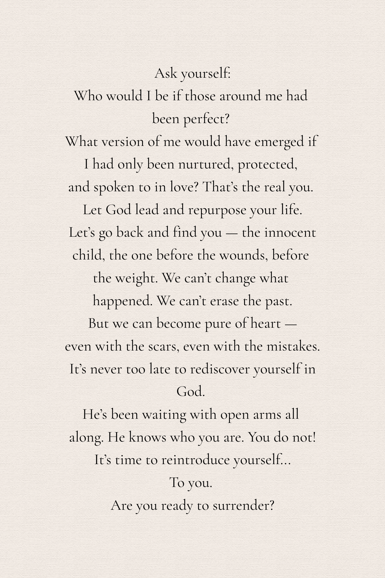 Find yourself in God—become who He intended you to be. Come back to yourself, to your purpose, to the life you were meant to live. For the soul searching, worn down, or ready to give up. This journal is a place to reflect, heal, and rediscover hope, meaning, and your connection to God. Every page invites you to pause, step outside of yourself and re-evaluate the person you've sworn you cannot change. Every question unravels the false ideas that someone or something else out on you, so you can find your true self. The one God intended you to be, before the world burdened you.